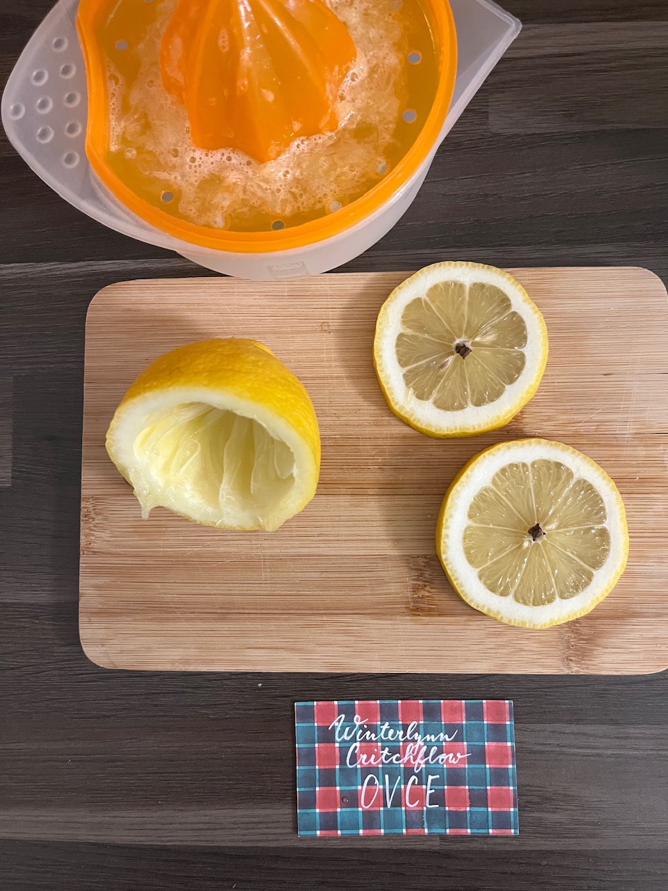 Půlku citronu vymačkáme, z druhé ukrojíme dva plátky. Pokud máme podezření na nadměrnou přítomnost mudlovské chemie, okrájíme z koleček kůru. Doprostřed plátků zapíchneme hřebíčky.